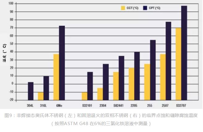 圖9給出了按照ASTM G 482(6% FeCl3)測(cè)定的固溶退火狀態(tài)下各種不銹鋼耐點(diǎn)蝕和縫隙腐蝕性能的比較。材料焊接狀態(tài)下的臨界溫度要低一些。臨界點(diǎn)蝕或縫隙腐蝕溫度越高,則表明材料耐腐蝕起始發(fā)生的能力越高。2205不銹鋼的CPT和CCT都顯著高于316不銹鋼。這使2205鋼成為用途廣泛的材料,適用于因蒸發(fā)導(dǎo)致氯離子濃縮的環(huán)境,例如熱交換器的蒸汽空間或保溫層的下面。2205雙相鋼的CPT還表明它可用在堿水和脫氣鹽水中。它還成功地用于脫氣海水中,在這些應(yīng)用中,通過高流速的海水或用其他方法使鋼的表面沒有沉積物。在苛刻的海水應(yīng)用環(huán)境中,如薄壁熱交換器管,或表面有沉積物或有縫隙時(shí),2205不銹鋼沒有足夠的耐縫隙腐蝕能力。然而,CCT高于2205的高合金化雙相不銹鋼如超級(jí)雙相不銹鋼和特超級(jí)雙相不銹鋼,已經(jīng)用于許多既要求高強(qiáng)度又要求高耐氯離子腐蝕的苛刻海水條件。盡管超級(jí)雙相不銹鋼在較低溫度的海水中不發(fā)生腐蝕,但其在高溫下的應(yīng)用有一定的局限性。特超級(jí)雙相不銹鋼更好的耐腐蝕性將雙相不銹鋼的應(yīng)用擴(kuò)展到強(qiáng)腐蝕性的氯離子環(huán)境如高溫?zé)釒У暮Kh(huán)境尤其是存在縫隙的場(chǎng)合。