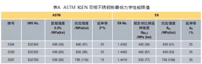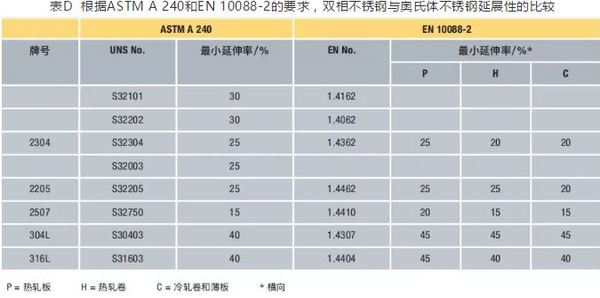 但是雙相不銹鋼的韌性和塑性通常比奧氏體不銹鋼差。奧氏體不銹鋼一般沒有塑性-脆性轉(zhuǎn)變,在低至深冷溫度的條件下仍保持優(yōu)異的韌性。表D給出了標(biāo)準(zhǔn)奧氏體不銹鋼和雙相不銹鋼在拉伸試驗(yàn)中最小延伸率的比較。