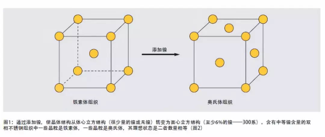 鎳是穩(wěn)定奧氏體的元素,鎳促使不銹鋼的晶體結(jié)構(gòu)從體心立方結(jié)構(gòu)(鐵素體)轉(zhuǎn)化為面心立方結(jié)構(gòu)(奧氏體)。鐵素體不銹鋼含極少的鎳或不含鎳,雙相不銹鋼含鎳量為低至中等,如1.5%~7%,300系奧氏體不銹鋼至少含有6%的鎳(見圖1、2)。添加鎳延緩了奧氏體不銹鋼中有害金屬間相的形成,但是在雙相不銹鋼中鎳的延緩作用遠(yuǎn)不如氮有效。面心立方結(jié)構(gòu)使奧氏體不銹鋼具有極佳的韌性。雙相不銹鋼中有近一半是奧氏體組織,因此雙相鋼的韌性比鐵素體不銹鋼顯著提高。