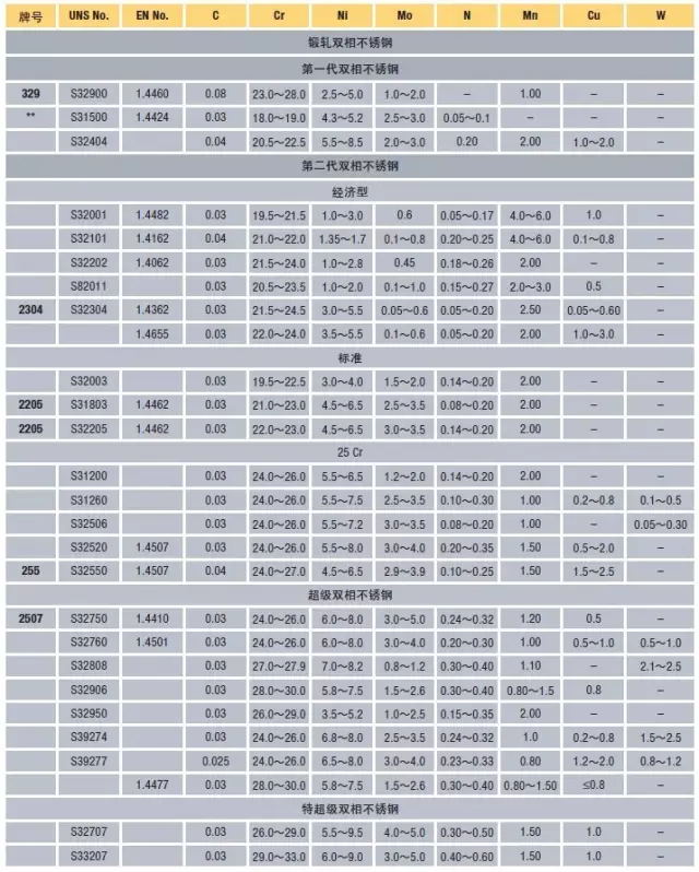 它還通過固溶強(qiáng)化提高了奧氏體的強(qiáng)度。雙相不銹鋼一般都添加氮并調(diào)整鎳含量以達(dá)到適當(dāng)?shù)南嗥胶?。鐵素體形成元素鉻和鉬與奧氏體形成元素鎳和氮相互平衡才能獲得雙相組織。
