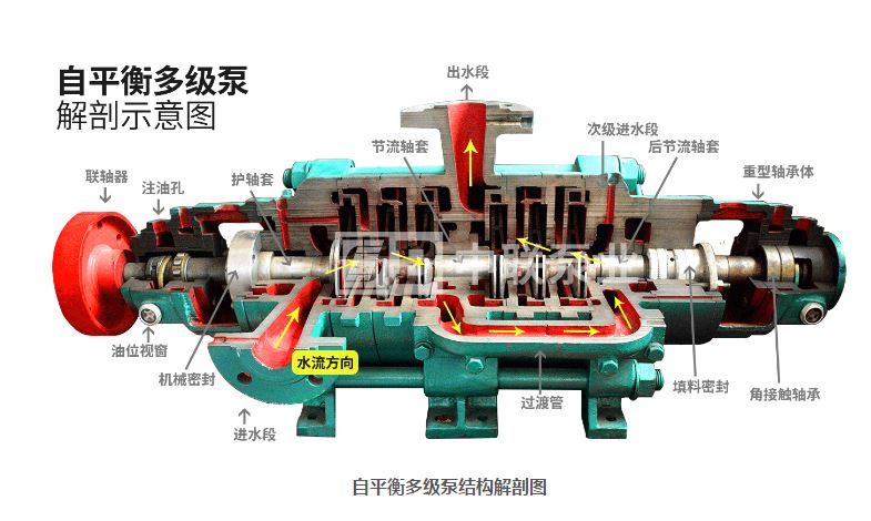 自平衡多級離心泵在水力模型上采用耐高壓、高性能設(shè)計,將傳統(tǒng)多級離心泵的結(jié)構(gòu)形式進行了創(chuàng)新,取消了多級離心泵的軸向力平衡機構(gòu),其運行效率是普通多級泵的3倍以上,使用戶的經(jīng)濟效益大大得到提高,生產(chǎn)成本大幅降低,是采用平衡盤或平衡鼓結(jié)構(gòu)的D、DG型多級離心泵最好的替代品。葉輪采用正反向?qū)ΨQ布置,使正、反兩組葉輪在運行中產(chǎn)生的軸向推力相互抵消,無軸向竄動。